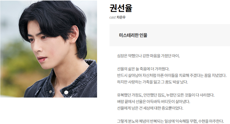 또한, 권선율 역의 차은우는 유복한 가정에서 자랐지만 부모를 잃고 거친 삶을 선택한 인물로, 은수현과 어떤 사건에 휘말리게 됩니다.