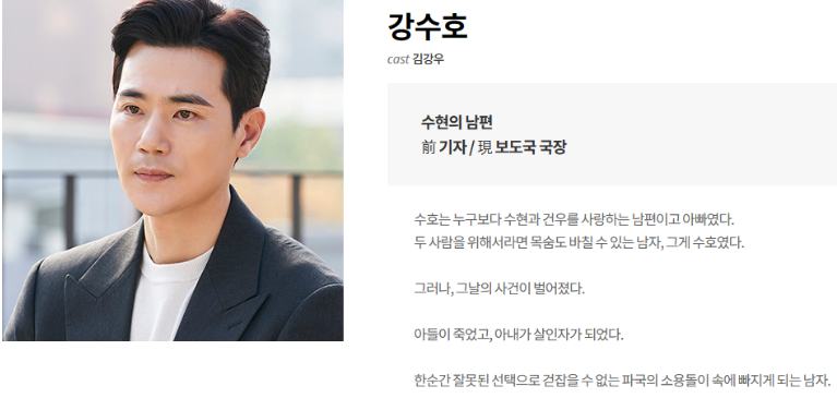 강수호 역의 김강우는 은수현의 남편으로, 기자에서 케이블 방송국 앵커로 활동하며 아내를 사랑하지만 어려운 상황에 빠지게 됩니다.