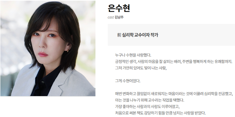 그녀의 삶은 이 비극적인 사건을 중심으로 전개되며, 이 과정에서 그녀는 비밀스러운 진실을 마주하게 됩니다. 은수현은 성공한 심리학 교수이자 작가로, 이상적인 삶을 살아가던 중 아들을 잃고 모든 것이 바뀌게 됩니다.
