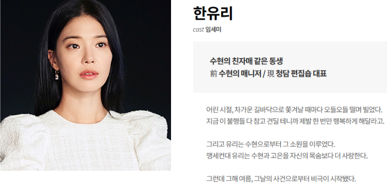 한유리 역의 임세미는 은수현의 절친한 친구이자, 은수현에게 의지가 되어주는 인물입니다. 이 드라마는 복수와 슬픔, 그리고 그 속에서 꽃피는 인간애와 치유의 과정을 섬세하게 그려낼 것으로 기대됩니다.